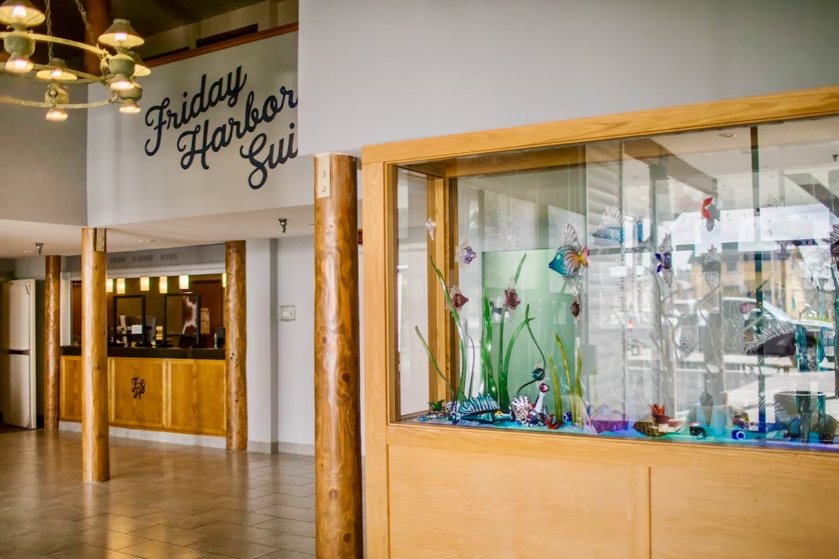 Our all-suites hotel is nestled on the outskirts of town, yet is within walking distance of the waterfront town of Friday Harbor. Almost all of the rooms are oversized and are more like apartments than hotel rooms, so we offer an outstanding value for the money. Some of the features and amenities you will come to enjoy at our hotel are cozy living rooms with gas fireplaces, separate bedrooms with queen and king-size beds and down-duvet comforters, thick terry bathrobes, complimentary coffee and tea, iron and ironing boards, Jacuzzi, spacious meeting and banquet facilities. Select rooms are now pet-friendly, accommodating our guests and their furry companions.