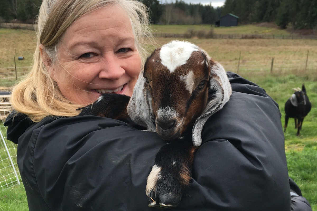 Enjoy a beautiful, guided hike with the whole herd on our 120 acres that walks along the pastures and heads into the forest. A trail takes us up hill and leads to a scenic overlook of the farm, where on a clear day, Mount Baker is in full view. This hike is slow and meandering, so the goats can munch along the way.