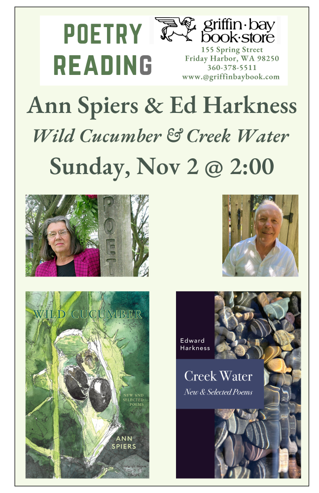 Ann Spiers, author of Wild Cucumber, and Ed Harkness, author of Creek Water share their poems Sunday November 2 in the Griffin Bay Bookstore Cafe on Spring St. Interweaving distinctive imagery of natural and made landscapes with details of local, political, and women’s history, Spiers poems explore the islands, beaches, and the volcanoes of the Pacific Northwest. Harkness’s range of form and subjects (in Creek Water) is so rich, you can open this volume anywhere to find moments of revelation.