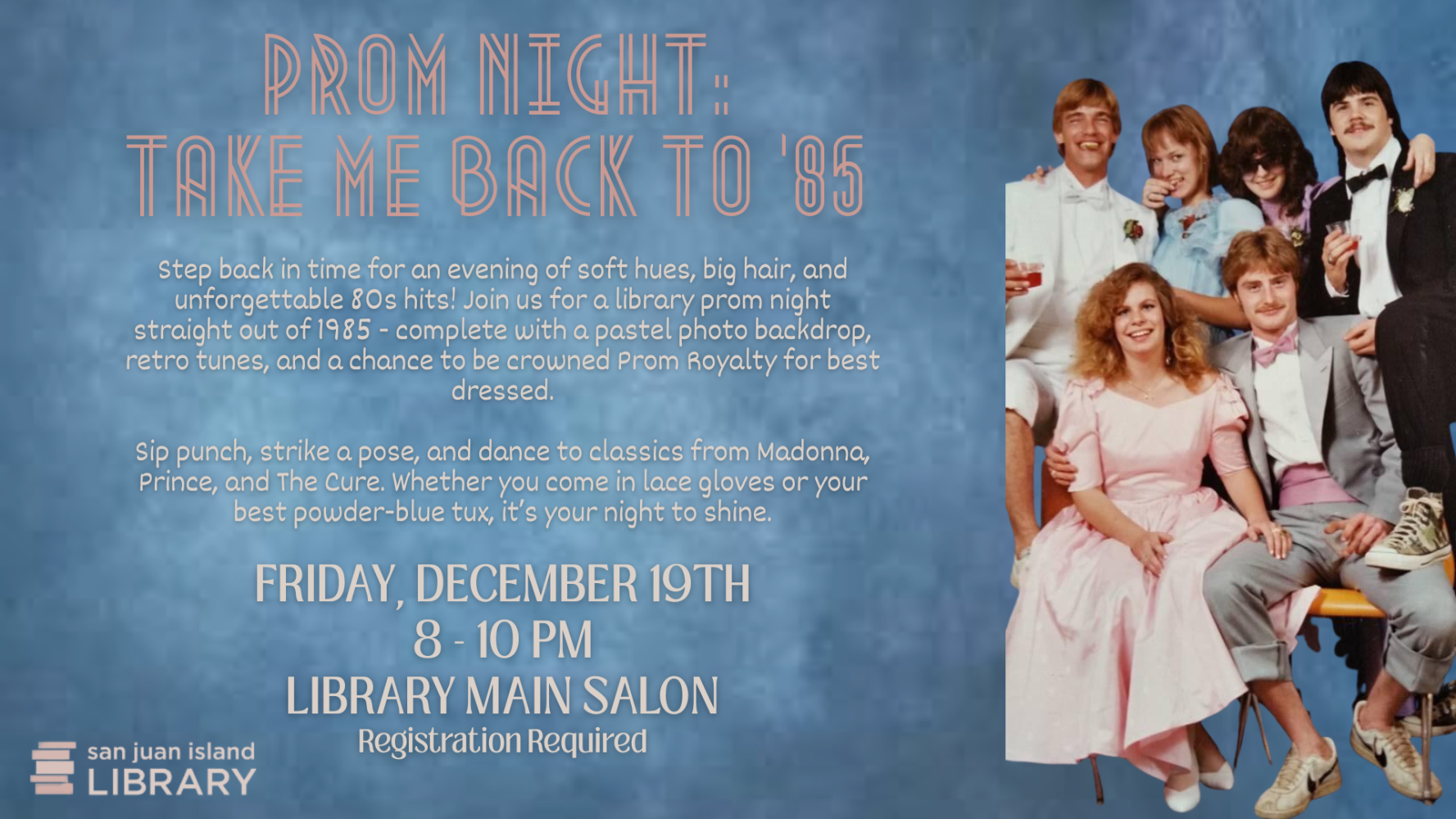 Dust off your vintage lace, pull out the pastels, and join us for a night of 80s nostalgia! Our library prom will feature an 80s playlist, photo area with retro props, and refreshments inspired by classic punch-bowl parties. Guests can even vote for Prom Royalty based on the best 80s-inspired look - think ruffles, sparkle, and charm. Whether you’re reliving your prom days or experiencing the magic for the first time, this evening promises lighthearted fun, laughter, and a perfect excuse to dance. Register today to reserve your spot! Each attendee needs to register, like, totally.