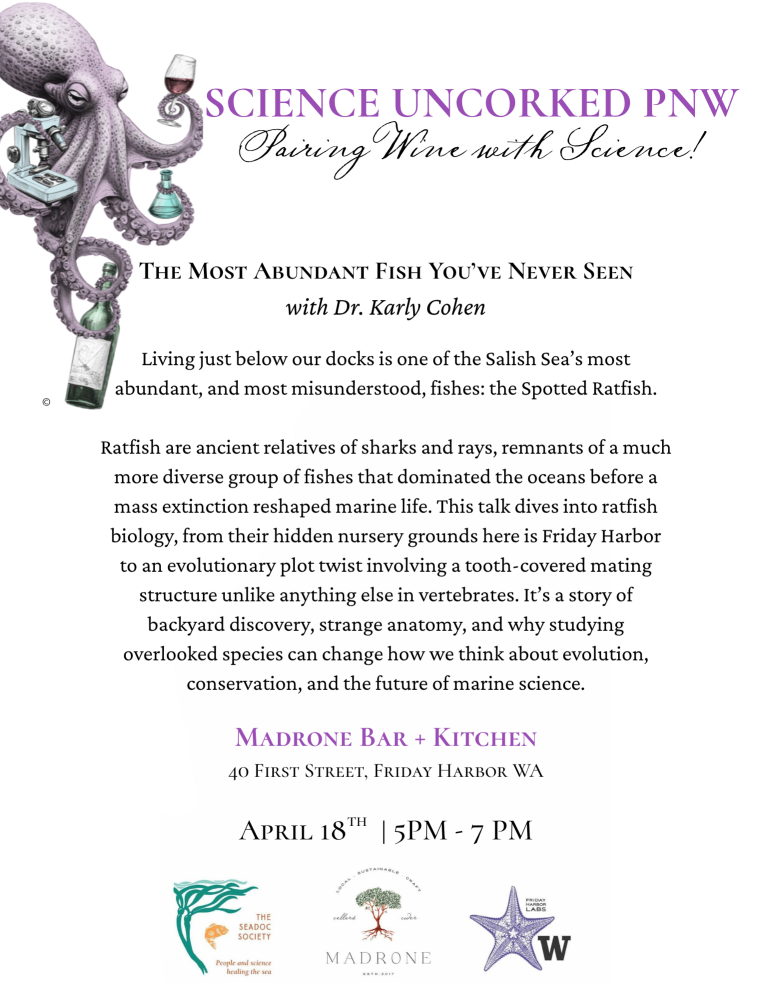 Join us for Science Uncorked at Madrone Bar + Kitchen! Living just below our docks is one of the Salish Sea’s most abundant, and most misunderstood, fishes: the Spotted Ratfish. Ratfish are ancient relatives of sharks and rays, remnants of a much more diverse group of fishes that dominated the oceans before a mass extinction reshaped marine life. This talk dives into ratfish biology, from their hidden nursery grounds here is Friday Harbor to an evolutionary plot twist involving a tooth-covered mating structure unlike anything else in vertebrates. It’s a story of backyard discovery, strange anatomy, and why studying overlooked species can change how we think about evolution, conservation, and the future of marine science.